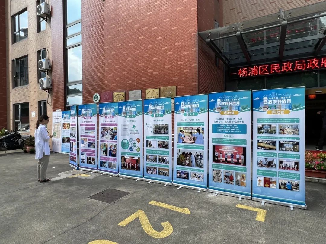 此外,活动还在养老院室外庭院中开设了“政府开放集市”,提供便民服务、养老服务政策问答以及“医养结合”为老医疗咨询,并以人才、服务、助餐三大版块展示了杨浦区养老服务成果。