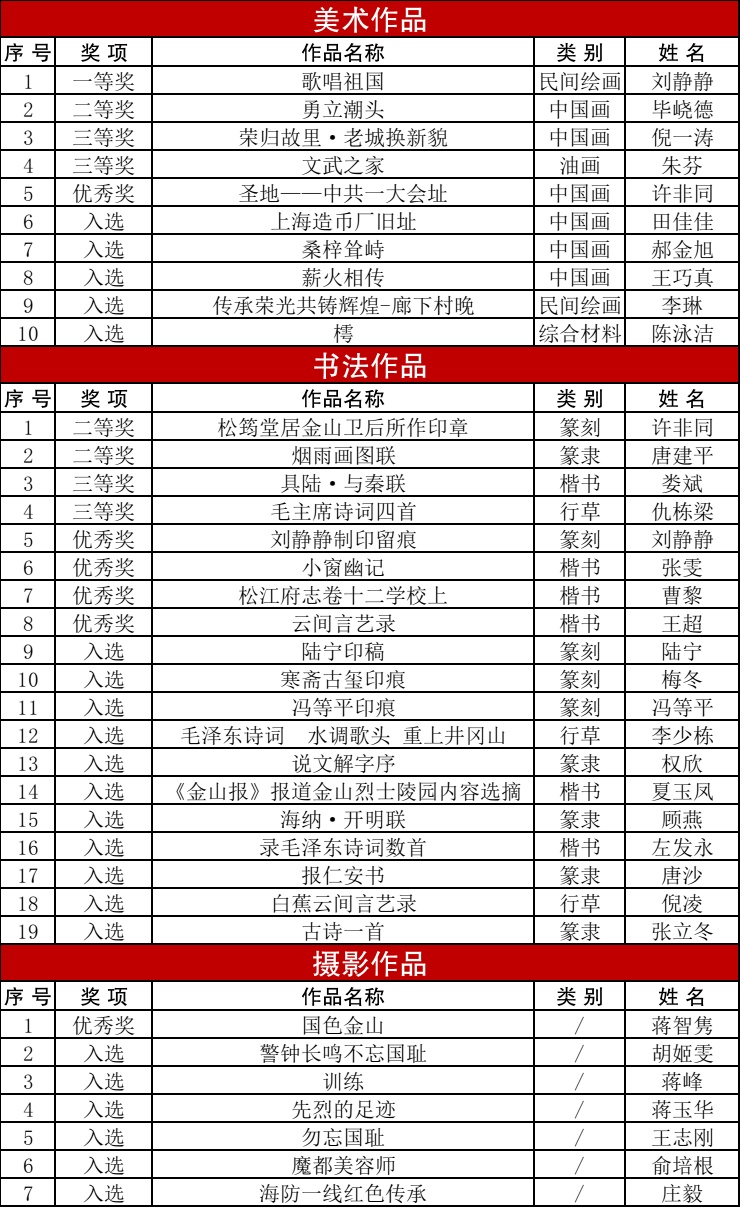 经金山区文化馆初评后选送115件作品,其中:美术15件,书法67件,摄影33件。