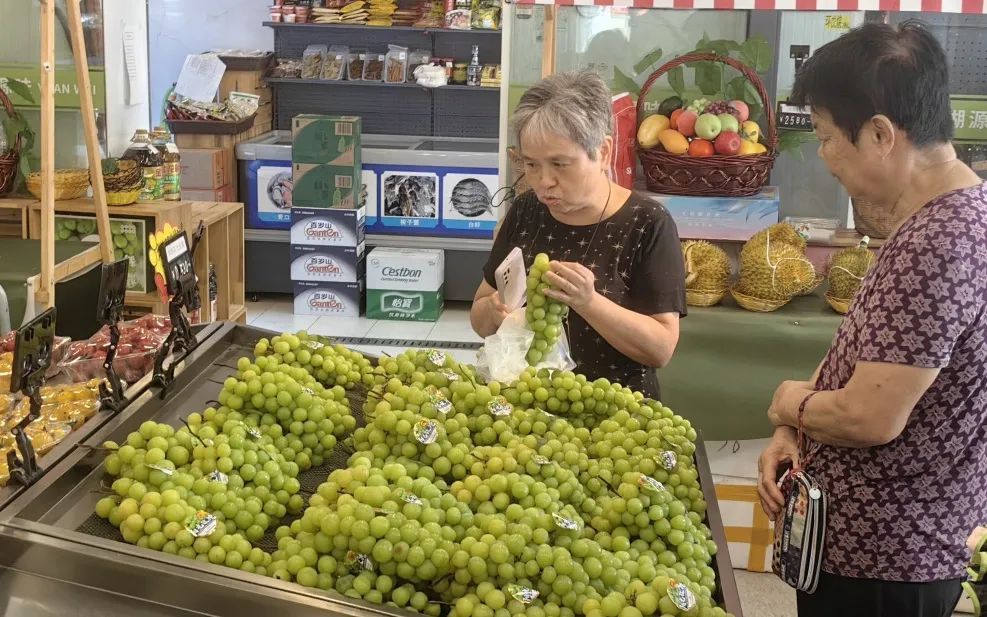 “今天买了点葡萄和番茄,试吃了下,都蛮好吃的,下次路过我还要来买一些。”“能在家门口买到这么新鲜的水果蔬菜真的很开心!”“上次买了点茭白,中午回家清炒一盘,鲜香美味,开胃又下饭!”家住界泾港社区的王阿婆与老姐妹们对店内的蔬果赞不绝口。