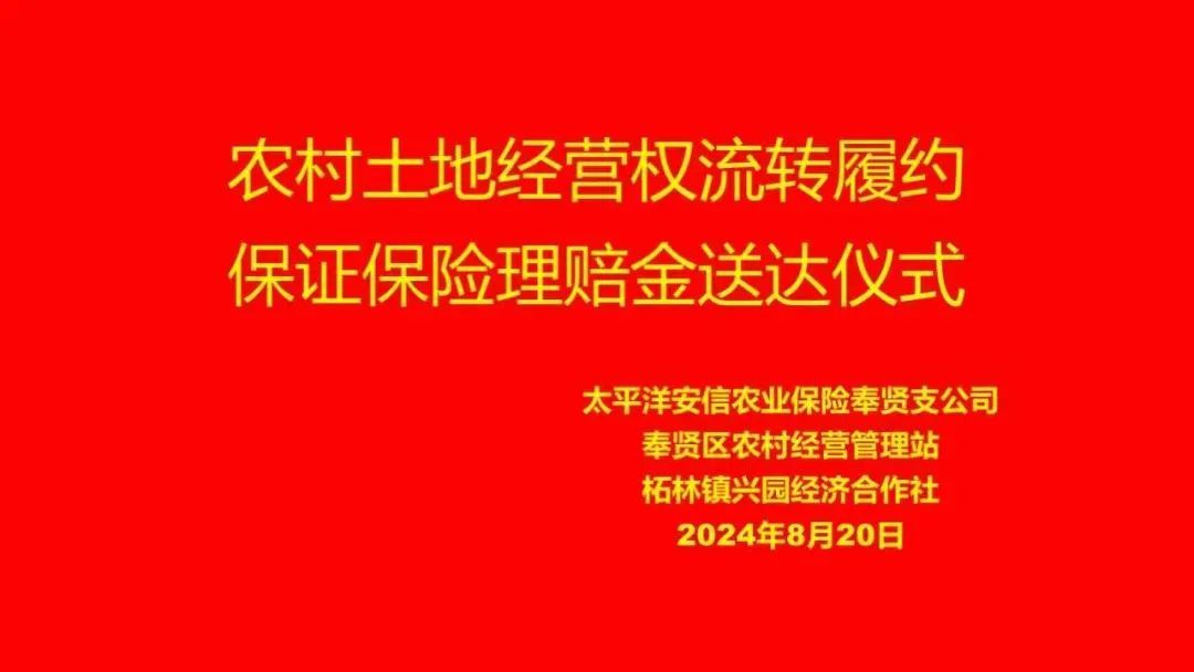2024年8月20日,一场土地流转履约保险理赔仪式在柘林镇兴园村举行,区农村经营管理站会同太平洋安信农业保险奉贤支公司(以下简称奉贤支公司),将345043元土地经营权流转履约保证保险理赔款交付至奉贤区柘林镇兴园经济合作社,标志着奉贤区保险机制参与土地流转风险管理工作取得了实质性成效。柘林镇、柘林农业农村服务中心、区农村经营管理站、奉贤支公司相关负责人出席并共同见证。 柘林镇兴园经济合作社在农村土地经营权流转过程中,由于土地流入的经营户存在欠费,在催讨无效的情况下,向人民法院提请诉讼,经开庭审理后法院依法作出判决。但案件的当事人依然无法履行判决结果,柘林镇兴园经济合作社向奉贤支公司提出了理赔申请,奉贤支公司开启快速理赔通道,顺利支付了赔款,不仅有效保障了村集体经济组织与农民的利益,也为土地流转风险管控工作奠定扎实基础。 奉贤区于2020年推出农村土地经营权流转履约保证保险政策(保费20元/亩/年,由区镇两级财政各承担50%),成为全市唯一实现农村土地经营权流转履约保证保险全覆盖的区。自2021年起顺利启动理赔程序,青村镇西吴经济合作社、南桥镇沈陆经济合作社分别拿到全区首批保险理赔款,而青村镇解放经济合作社更是获得过55.67万元的单笔最大赔款。 农村土地经营权流转履约保证保险政策的创新出台和持续执行不仅有效保障了农户的合法权益,还促进了土地流转市场的健康发展,为推进乡村振兴战略和提高农民收入提供了有力支撑。奉贤区将继续深化土地流转风险防范机制,强化政策落实,确保广大农户的利益得到切实有效保护。