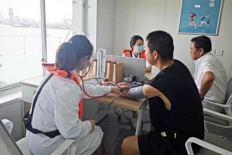活动现场还设置了义诊服务,邀请了杨浦区中医医院的全科医生为船员提供问诊服务,针对船员日常生活中的常见病进行常规血压、把脉听诊等检查,同时提供养生知识讲解等健康咨询服务,向船员赠送夏季中药茶饮包和化湿香囊。