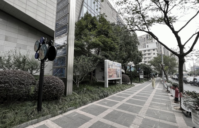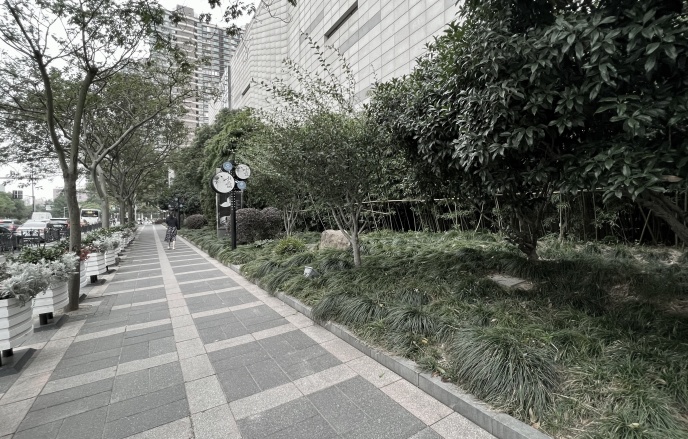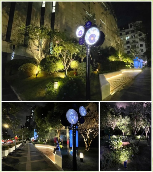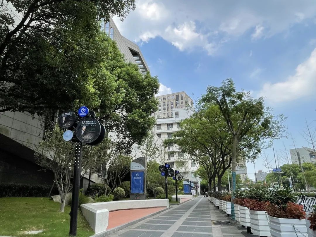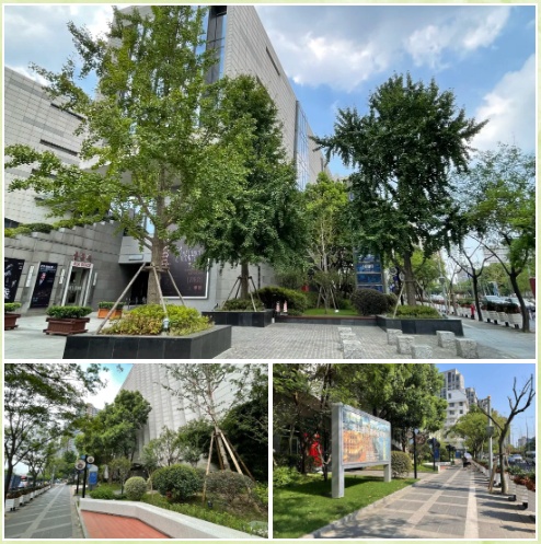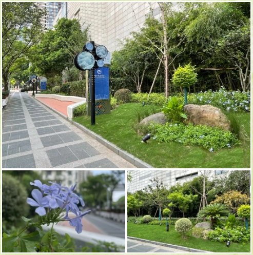 改造后,最大限度地尊重原有自然生态,保留长势较好的竹林、绿化,围绕街边林木设计景观布局。植物搭配呼应海上文化中心的人文氛围,多采用观花观叶型苗木,如蓝雪花、金森女贞等色彩类植物,在夏日营造浪漫芬芳、清新淡雅的氛围,漫步在其中犹如置身于印象派油画之中,使市民得到视觉和心灵上的治愈。