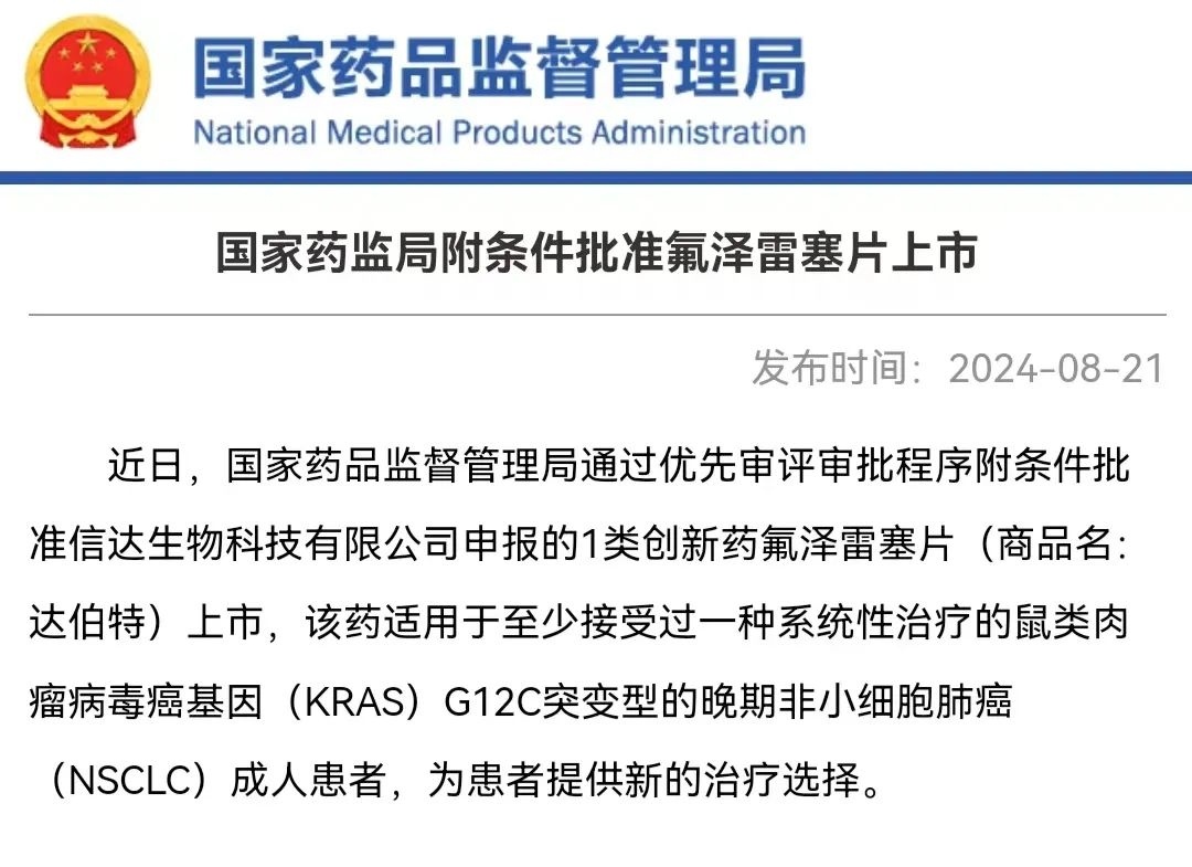 市药监局介绍,近日,国家药品监督管理局通过优先审评审批程序附条件批准信达生物科技有限公司申报的1类创新药氟泽雷塞片(商品名:达伯特)上市。该药适用于至少接受过一种系统性治疗的鼠类肉瘤病毒癌基因(KRAS)G12C突变型的晚期非小细胞肺癌(NSCLC)成人患者,为患者提供新的治疗选择。该药是国内首个批准上市的KRAS抑制剂药物。
