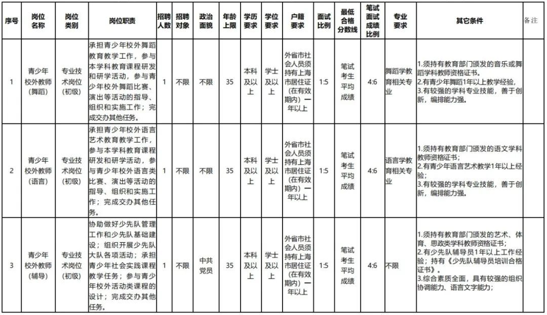 2.具备招聘单位规定的岗位聘用要求、资格条件、工作能力和身体条件详见附件1《2024年上海市青少年活动中心(上海市青年发展服务中心)公开招聘(第二批)简章》(点击“阅读原文”查看)。