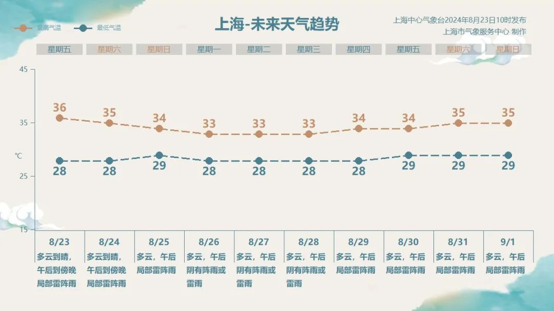 天气趋势:周六上海继续受副热带高压控制,维持晴热高温天气,最高气温在35℃左右。下周一前后天气形势发生调整。这和今年第10号台风“珊珊”有一定关系。虽然“珊珊”未来对我国海域无影响,但它将和北方冷空气联手,使得近期庞大的副热带高压断裂成东西两环,上海下周初和周中处在副热带高压边缘,降水频繁,同时气温也将略有下降。