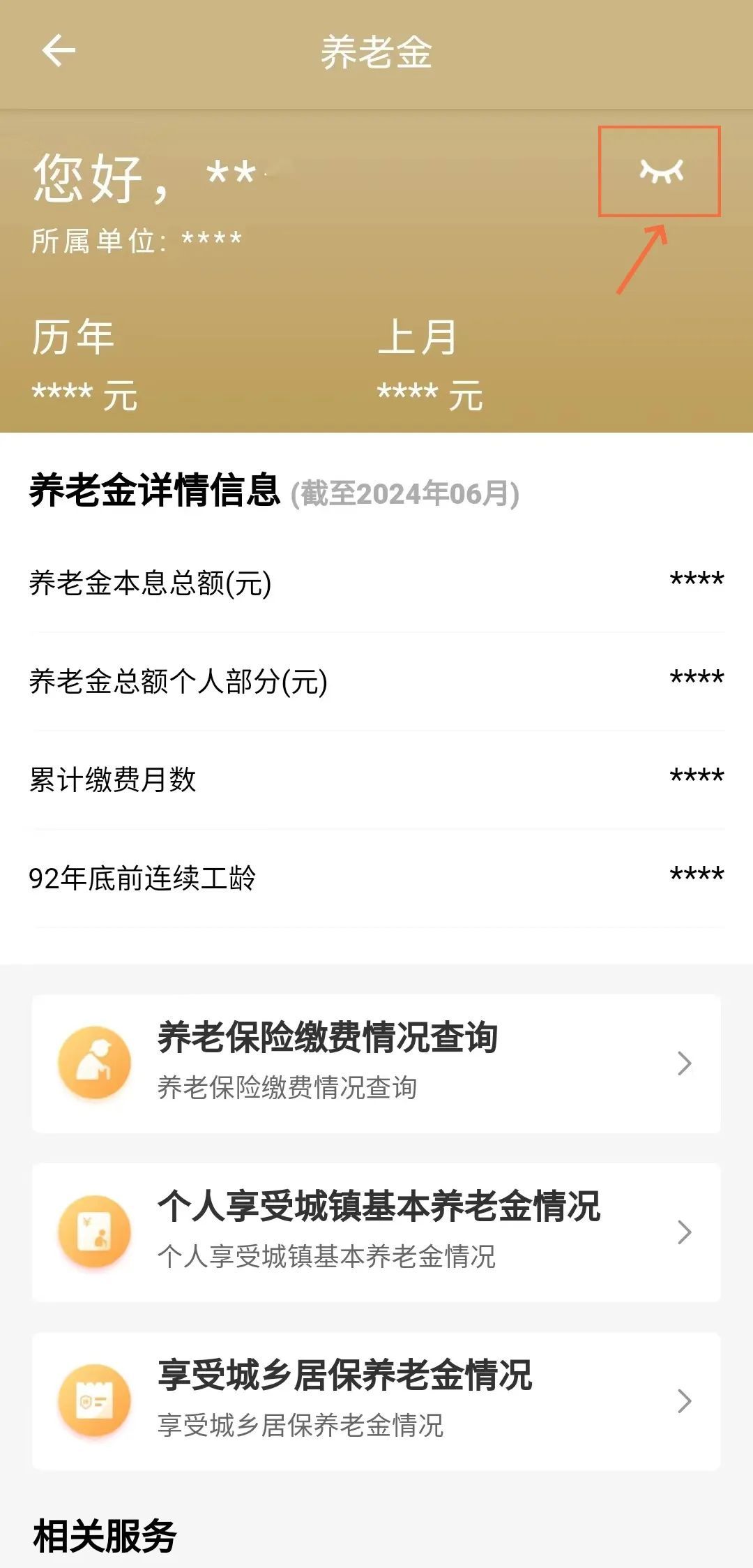 进入养老金界面后,点击右上角的“小眼睛”,就可以看到自己养老保险的缴费信息啦。