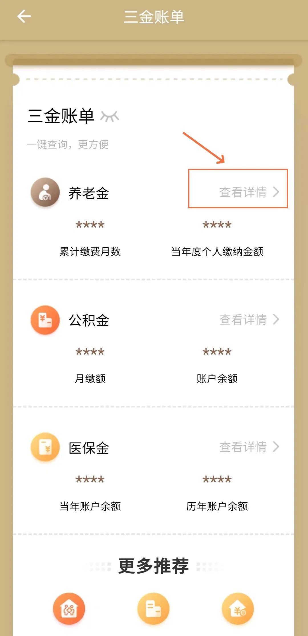 登录“随申办市民云”账号,点击首页的“三金账单”,其中第一个就是养老金信息,点击“查看详情”进入查询界面。