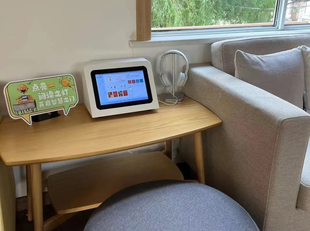推开大门,一台儿童绘本阅读机映入眼帘,内含国学、科幻、历史、名著等11个大类近万册正版漫画高清电子书,深受孩子们喜爱。