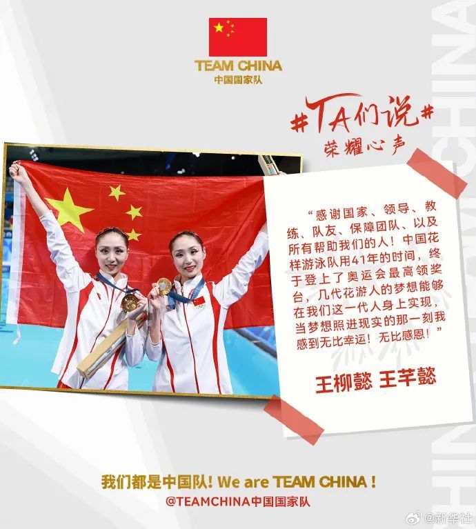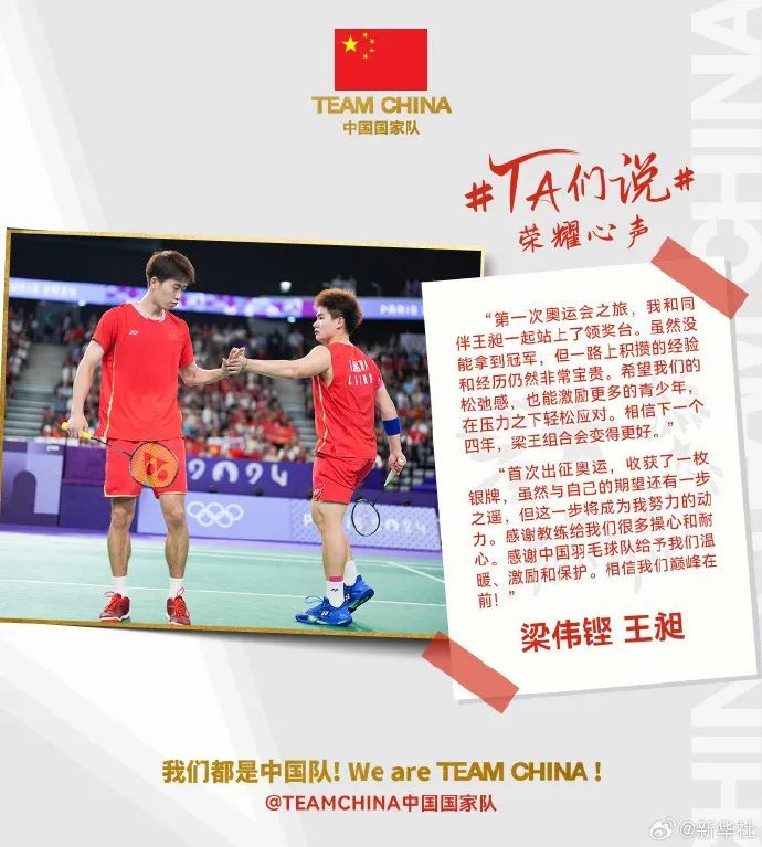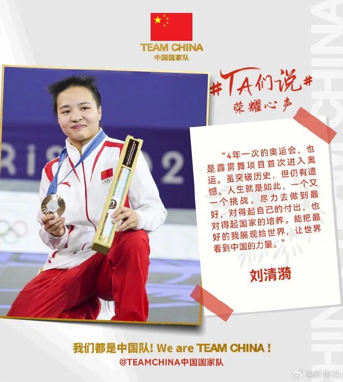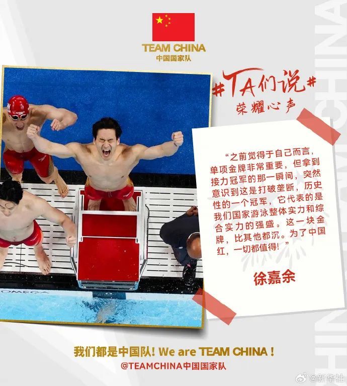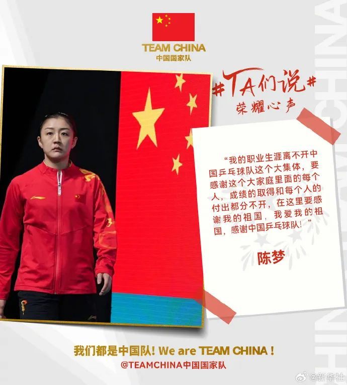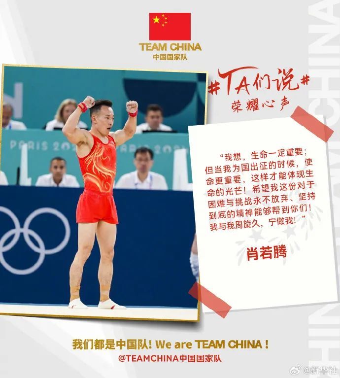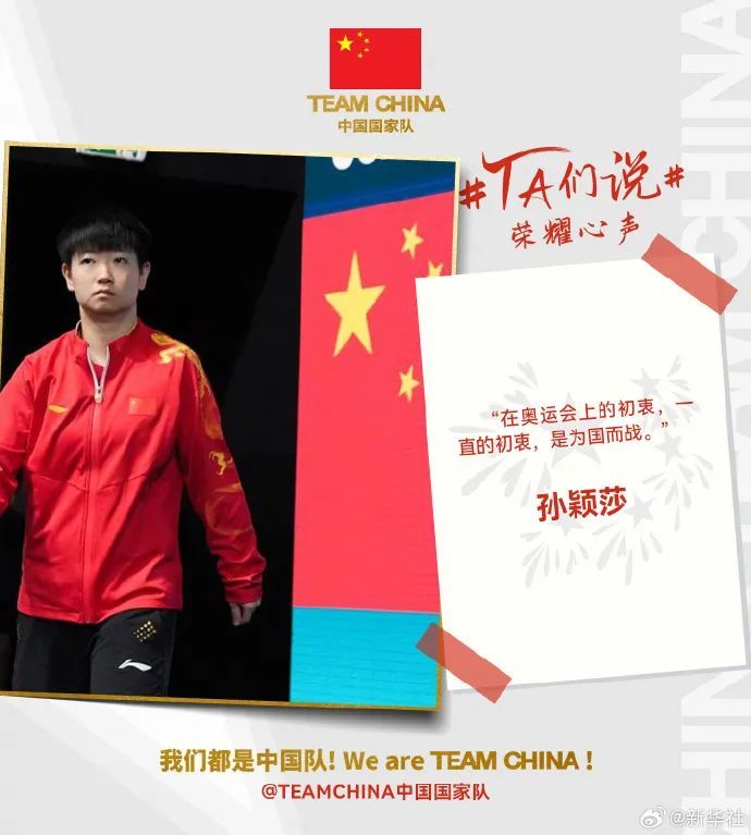 中国国家队发布巴黎奥运健儿心声海报。孙颖莎:“在奥运会上的初衷,一直的初衷,是为国而战。”陈梦:“感谢我的祖国,我爱我的祖国!”徐嘉余:“为了中国红,一切都值得!”