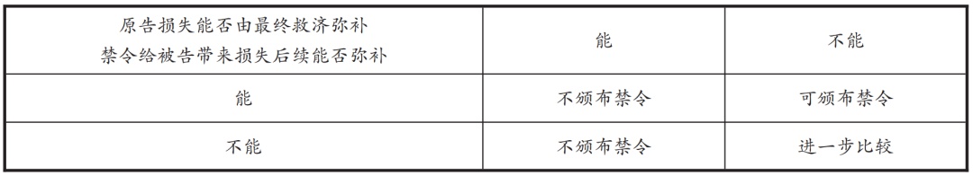 美国学者结合不可弥补损失要件,对困难衡量要件各情形采用了交叉比较方法,具体如下表: