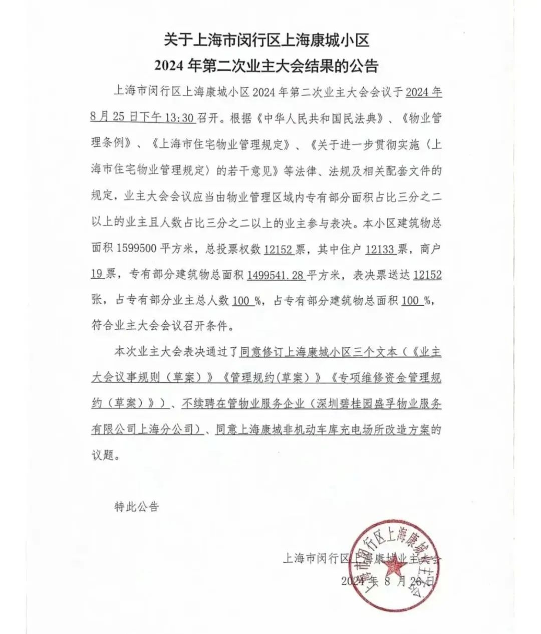 就在一个月之后的8月26日,上海康城第五届业主委员会在微信公众号上发布了此次业主大会的最终结果,称经小区业主投票表决,决定不再续聘在管物业服务企业。