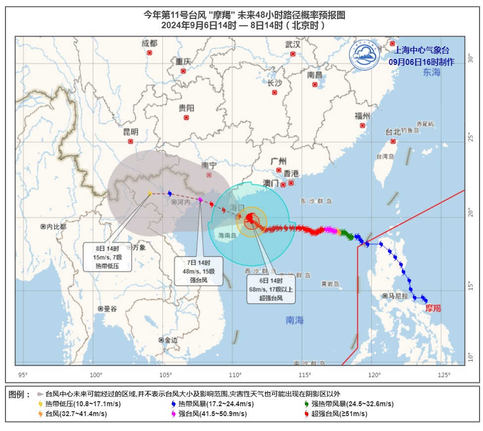 昨天16时20分,今年第11号台风“摩羯”登陆海南省文昌市沿海,登陆时强度为超强台风级,近中心最大风力17级以上,是登陆我国的最强秋台风。未来三天,海南、广东、广西等地天气恶劣,多地停工、停课。有计划前往上述地区的市民请务必注意调整行程。
