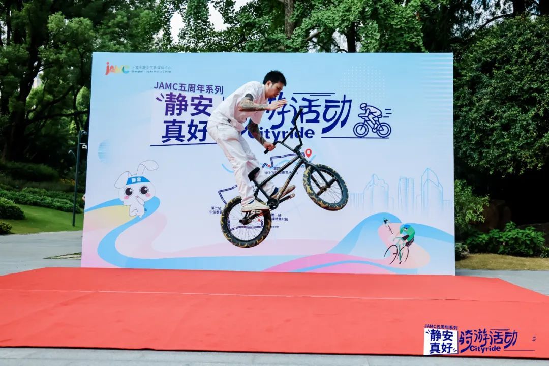 晨光初照,辅德里公园就已迎来了一众骑行爱好者们。随着音乐的响起,小轮车表演拉开了活动的序幕,刺激吸睛的表演,瞬间点燃了现场氛围。随着鸣笛声响起,活动正式开始,骑友们在领队和安全员的带领下,穿梭于静安的标志性地点之间。