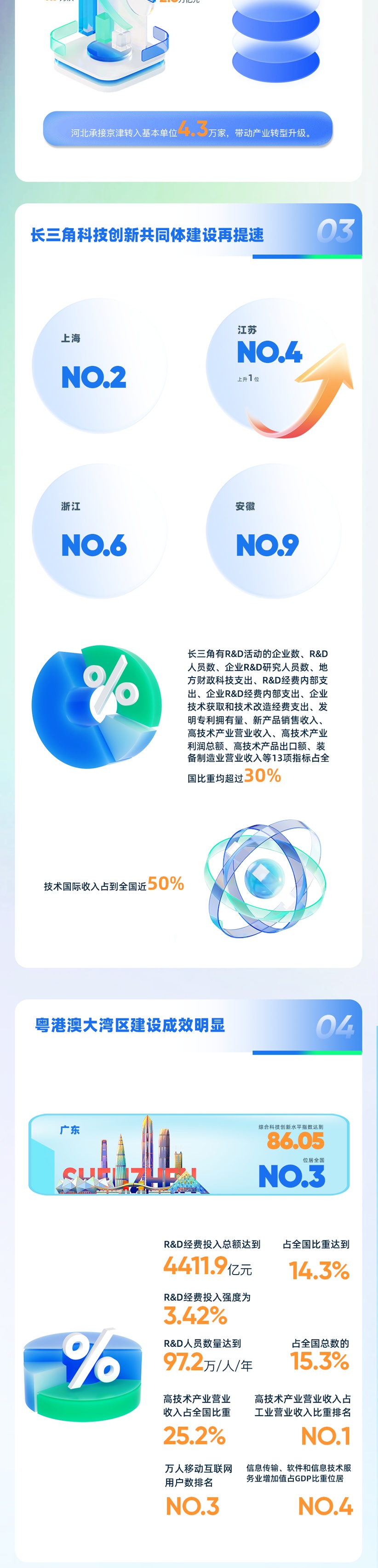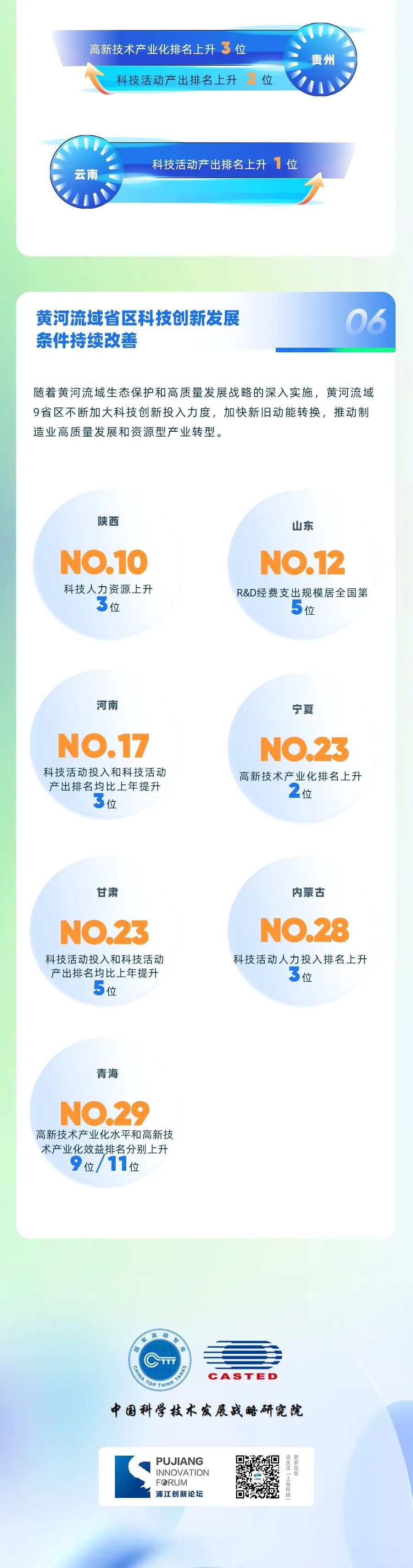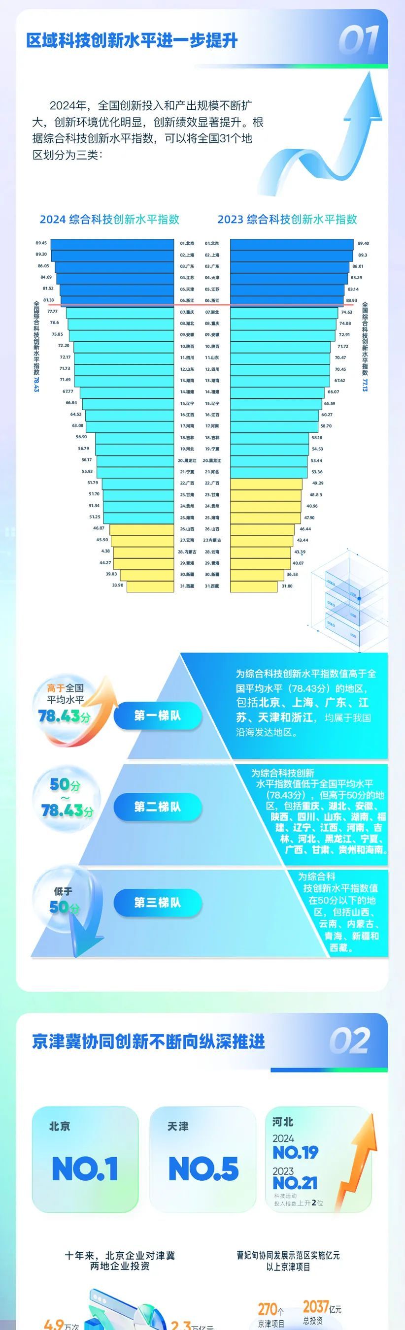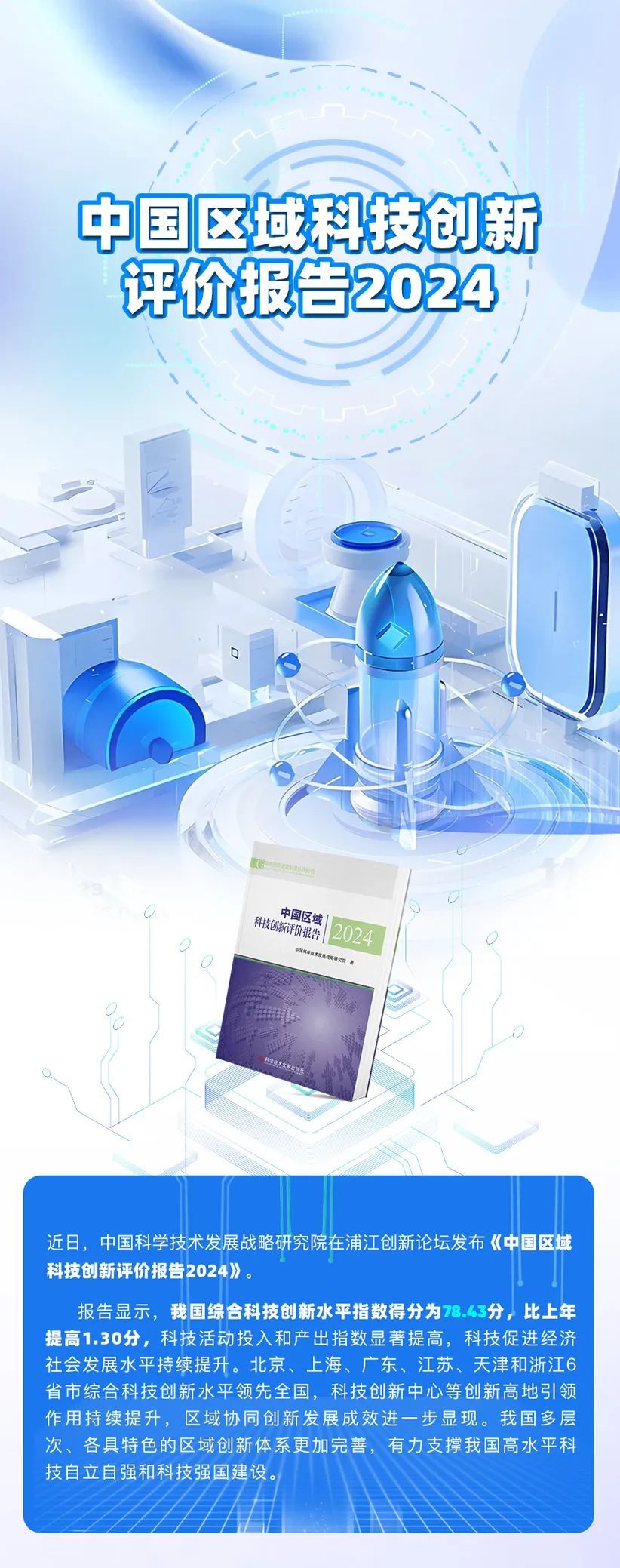 9月8日,中国科学技术发展战略研究院在浦江创新论坛发布《中国区域科技创新评价报告2024》。报告显示,我国综合科技创新水平指数得分为78.43分,比上年提高1.30分,科技活动投入和产出指数显著提高,科技促进经济社会发展水平持续提升。北京、上海、广东、江苏、天津和浙江6省市综合科技创新水平领先全国,科技创新中心等创新高地引领作用持续提升,区域协同创新发展成效进一步显现。我国多层次、各具特色的区域创新体系更加完善,有力支撑我国高水平科技自立自强和科技强国建设。