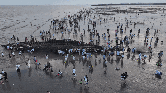 这个夏天,随着海湾旅游区渔人码头的重新开放,一波波“赶海大军”接踵而至。而就在退潮后的滩涂上,有这么一艘快散架的渔船却成了不少游客拍照打卡的背景。有人不禁疑惑,这艘渔船是从哪里来的?为何一直躺在这里,它有着怎样的故事?今天,小编就来为你揭开这其中的故事! 在奉贤区摄影家协会夏其林的相机里 拍摄了不少渔人码头滩涂的赶海照片 而这条船也多次出现在照片中 夏其林对这艘船产生了浓厚的兴趣 于是他就在微信群朋友圈询问 想看看有谁知道它的“故事” 结果 还真有人知道 知情人是奉贤的一位市民叫潘顺贤 原先是奉贤区渔政站执法大队的大队长 他说这船得从19年前的那场台风说起…… 2005年8月 台风麦莎不知道还有多少人能记得 当年这个台风是在浙江玉环登陆 由于“麦莎”威力强大 当时本区的渔船接到通知全部要进港停靠 但这条渔船被发现还没进港 于是工作人员立即向防汛指挥部汇报 经了解后 得知这艘渔船是来自金山区山阳镇渔业村 因无法停靠到金山区 于是来奉贤金汇港避险 不料船开到奉贤渔人码头外侧时 船机又出现了故障 于是只能抛锚在此 落潮后搁滩 当时渔船上有三名渔民 他们徒步沿滩涂走到海湾旅游区街上 购买配件后再返回修船 然后等涨潮后再进金汇港避风 哪知当晚台风很大 涨上来的潮水浪急 导致船舱进水 船上三人还被困住了 当时 奉贤海湾边防派出所得知情况后 迅速出警 8位救援人员用绳索绑在一起 手挽手下海救援 成功将三位渔民救上岸 但木质的渔船在强大的台风中已严重损坏 已经无法修复 之后的潮涨潮落 渔船上的设备也随波逐流 只有现有大家看到的船体龙骨遗留至今 那么这艘渔船残骸今后怎么处理 能否继续留在滩涂上供游客拍照 据了解,目前船残骸上已无污染物 对周围水域生态并无影响 因此暂时也不考虑清理掉 不过,景区也提醒赶海的游客 因这艘渔船残骸最高处有2米左右高 建议市民游客在游玩时尽量不要去攀爬 以免发生意外事故