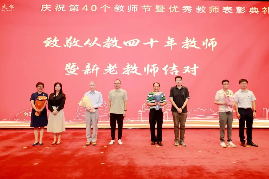 在致敬从教四十年教师环节,新进教师代表为从教四十年教师代表献花,学习他们矢志不渝、无私奉献的高尚品格,从教四十年教师代表为新进教师代表赠送校徽,鼓励他们传承上大“自强不息、道济天下”的校训精神,爱岗敬业,潜心育人。
