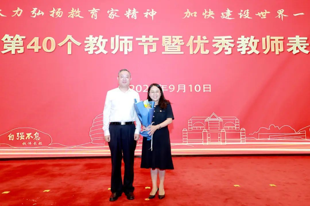 成旦红书记为“全国五一劳动奖章”的获奖教师颁赠鲜花。