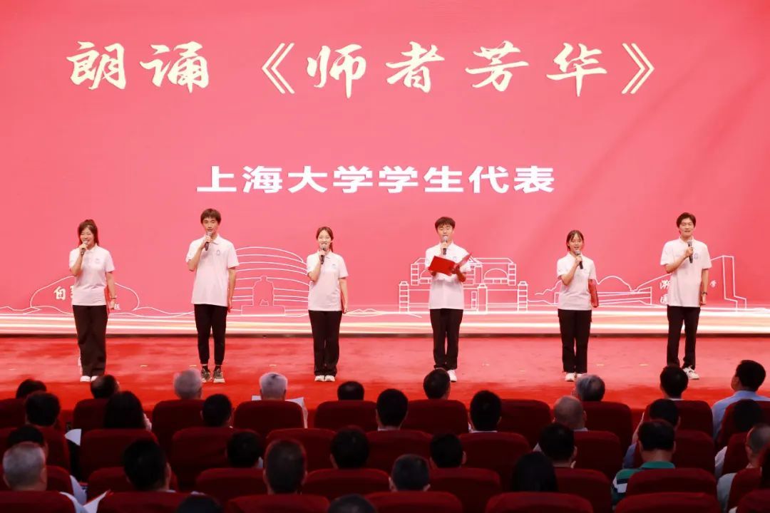 学生代表为大家带来的诗朗诵《师者芳华》,生动展现了上大教师为党育人、为国育才,扎根三尺讲台,潜心教书育人的美好画面,表达了学生对老师们以赤诚之心、奉献之心、仁爱之心投身教育事业的赞美之情与崇高敬意。