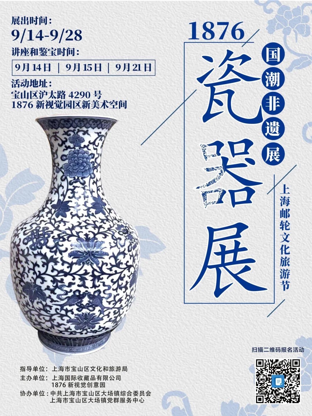 为迎接“上海邮轮文化旅游节” “悠游宝山艺术繁花”系列之1876国潮非遗展 将在1876新视觉创意园举办系列活动 9月14日-9月28日 瓷器展览 9月14日、9月15日、9月21日 青花瓷、单色釉和景泰蓝主题讲座 市民免费鉴宝体验活动 讲座及鉴宝体验 扫描二维码报名 主讲人:陈克涛 上海市收藏协会副会长 上海拍卖行业协会艺委会副主任 上海拍卖行有限责任公司高级顾问 上海市收藏协会学术委员会主任 活动亮点 一、专题瓷器免费讲座 现场不仅可以看到不同年代不同材质的瓷器,还能听专家讲解代表中国文化的瓷器相关知识。 二、市民免费鉴宝 报名参加活动可以带着自己的宝贝,来现场鉴定体验 青花瓷作为中国陶瓷艺术的瑰宝,其独特的蓝白色调和精美的绘画风格,吸引了无数陶瓷爱好者的目光。