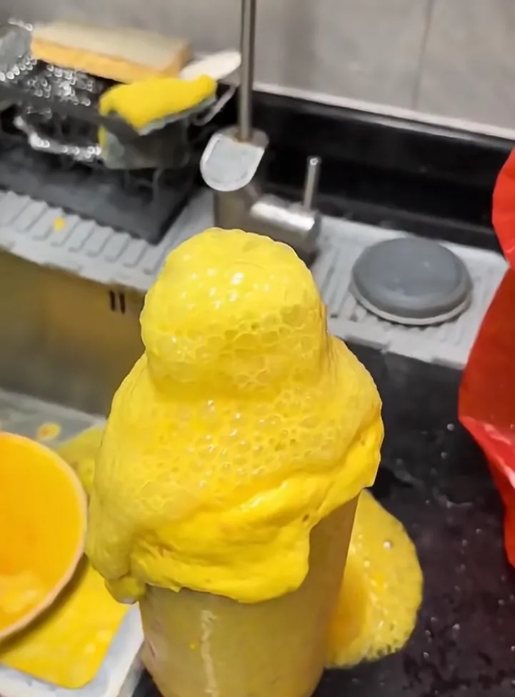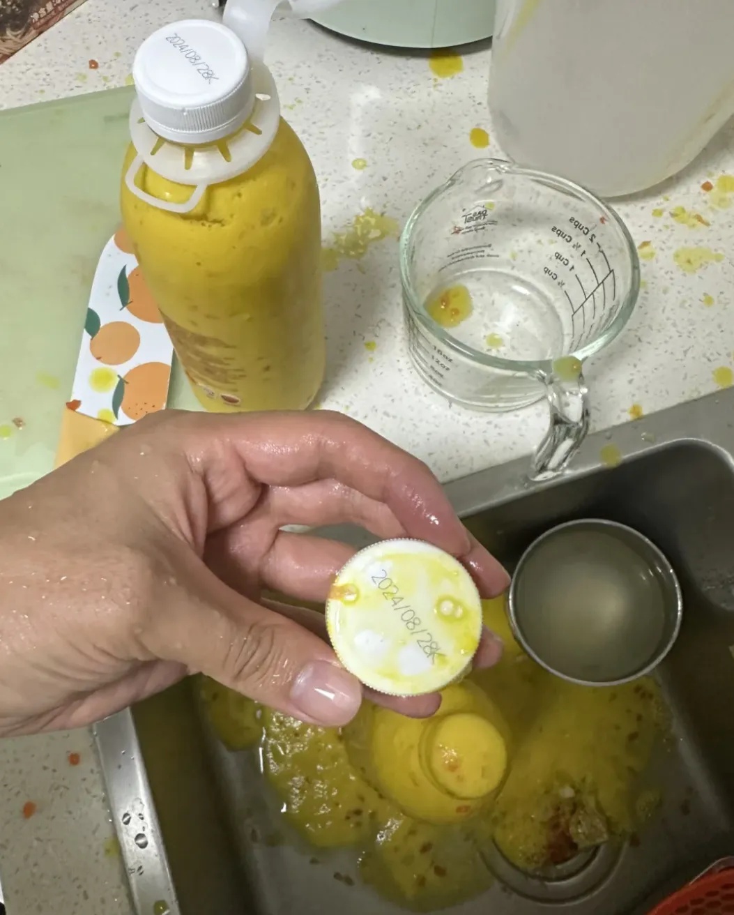 为什么要冷冻?因为在冷冻状态中,百香果果汁和果酱会从液态变成固态,固化的状态阻挡了发酵气体冲出,使其只能在缝隙中缓慢释放,进而降低爆炸风险。