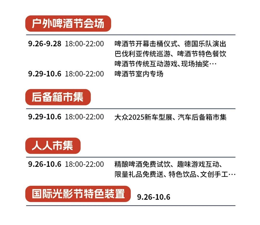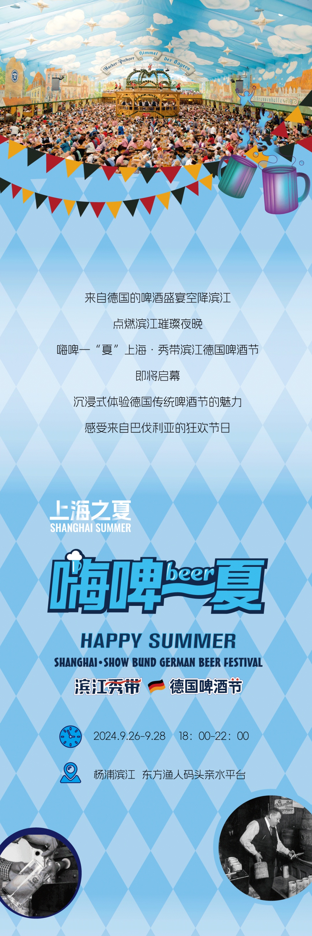 9月26日至9月28日晚上 来自德国的啤酒盛宴 即将空降杨浦滨江 点燃滨江璀璨夜晚 嗨啤一“夏” 上海·秀带滨江德国啤酒节 即将启幕! 为进一步提振消费信心,激发消费活力,打响消费品牌,首届“上海之夏”国际消费季重磅推出“7+58+X”等百余场商旅文体展活动,将点燃上海夏季消费热情,为国内外旅客提供高品质暑期休闲度假服务。 在“上海之夏”国际消费季期间,杨浦以“玩转杨数浦”为主题,开展系列活动。其中上海·秀带滨江德国啤酒节作为全市58场重点活动之一亮相申城,闪耀杨浦。杨浦滨江,作为杨浦区最重要的水岸载体,正全力打造全域旅游特色示范区,引入形式多样的主题活动,激活商旅文体一体化融合的内生动力。