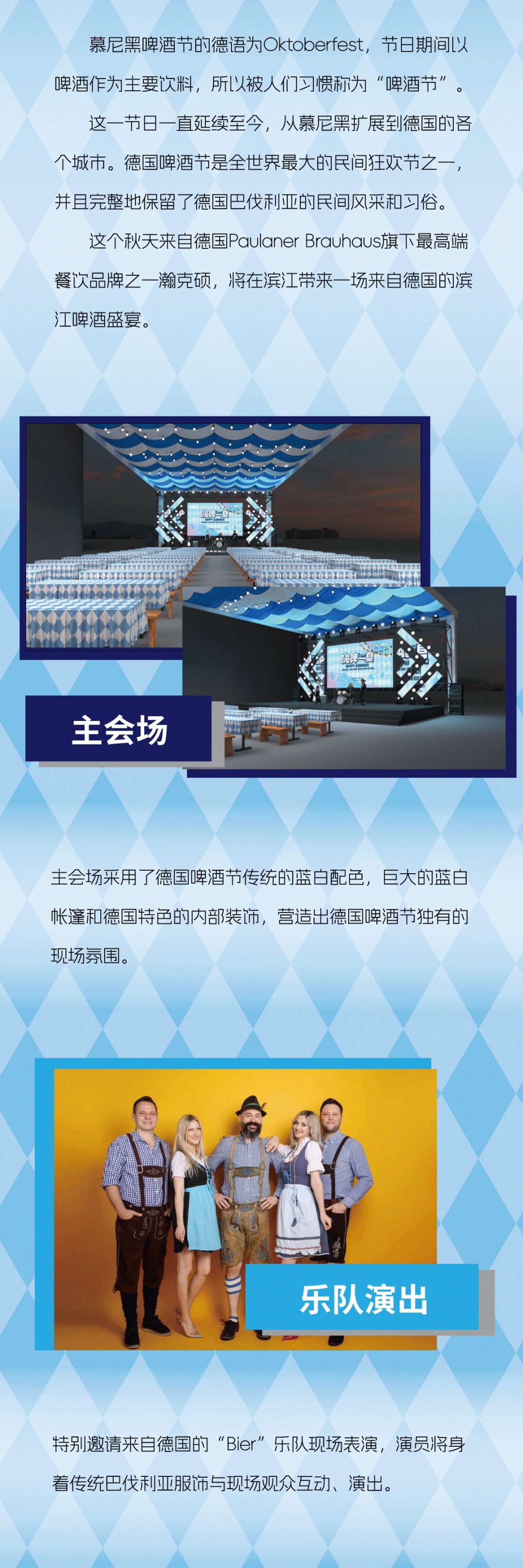 本次秀带· 滨江德国啤酒节最大程度上还原“德国慕尼黑啤酒节”原汁原味的节日氛围,并且同时提供宝莱纳旗下两大知名啤酒品牌Hacker-Pschorr和Paulaner供您选择,这两大啤酒品牌也是“德国慕尼黑啤酒节”上销售最为畅销的品牌。啤酒节活动主会场更是搭建起拥有巴伐利亚风格设计的大型帐篷,有大快朵颐的德餐美食,还有专业演出乐队也莅临主会场,载歌载舞,点燃上海之夏。