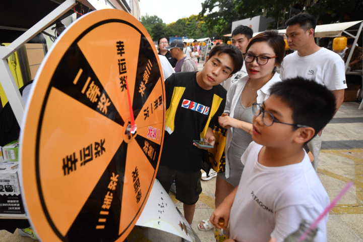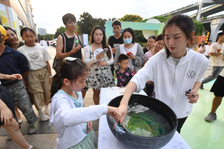 大拇指广场上的孩子们放飞手中的竹蜻蜓,夏末秋初的晚风,载着小小的竹蜻蜓,在孩子们的笑声里飘向云端。家住虹悦城附近的朱女士一家三口在活动现场的非遗集市里驻足,“小朋友对漆扇印制的过程很好奇,就这样把扇子浸在颜料中拎起来,就有了千变万化的一面扇子。”在本次活动现场,非遗市集的人气火爆。南京绒花、非遗灯彩、甲马画印刷……现场开设的课堂,互动教学,让古老技艺焕发出崭新的生机与活力。