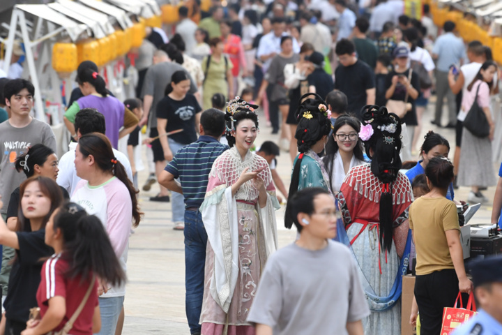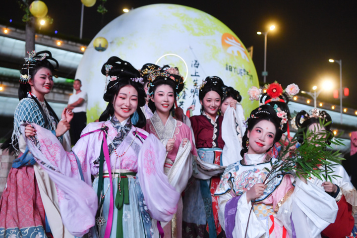 汉服翩翩,舞动中秋,国风大典,闪耀神州。中秋汉服秀震撼登场,法海寺壁画、《洛神图》汉服完美复原,唐风舞蹈、鼓踏飞燕、国潮乐团等节目依次上演,在活动现场引领市民和游客穿越时空,领略古代的风华绝代。“现在的年轻人穿上这些汉服,真别说,有模有样的!”家住安德门附近的陈爷爷带着老伴在活动现场转了两圈,“南京的雨花区有很多的故事,中秋节是咱们的传统节日,通过举办这样的活动讲讲咱们城市的故事,很不错。”