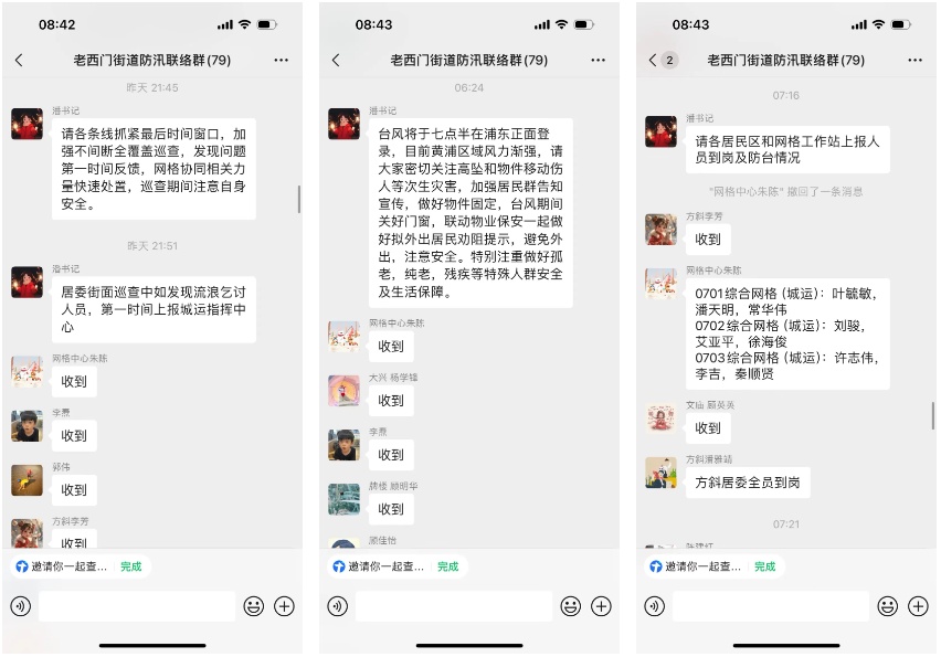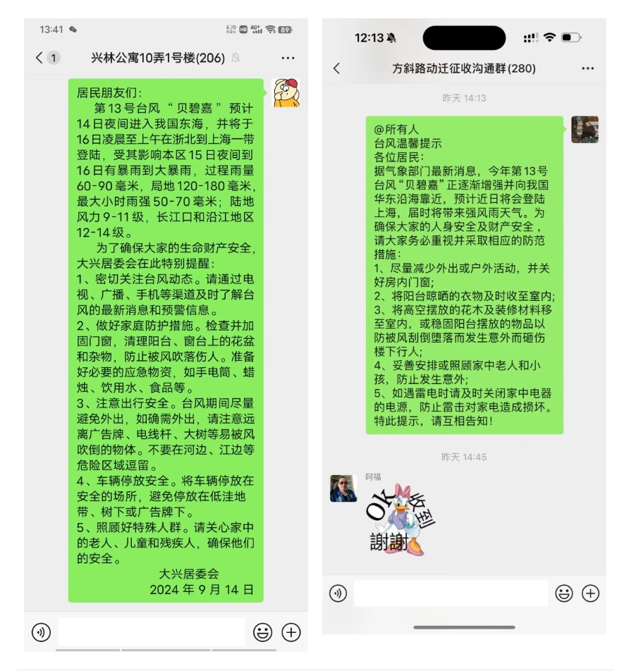 同时,街道开展全平台、多角度、各方位的防汛防台报道和预警提示,利用微信公众号推送防汛防台相关知识,通过微信群发布相关提示信息,加强台风预警的传播力度。各居委、物业广泛动员和提醒广大居民做好各自阳台、窗台物品清理及室外物件加固,避免高空坠物伤人。