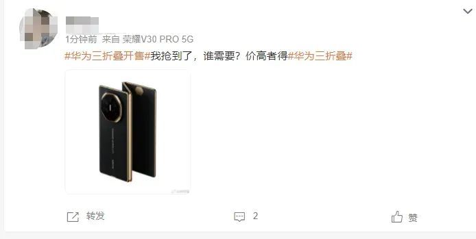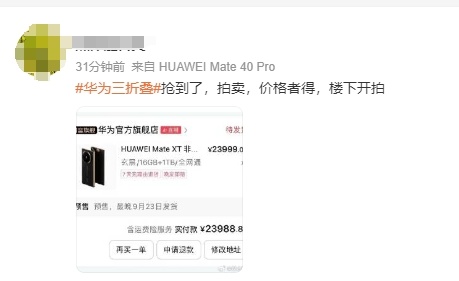 有媒体报道,华为三折叠屏手机价格遭到爆炒,根据一些网传图片,渠道首批成交价甚至高达38万到65万元,其火爆抢手程度可以想象。