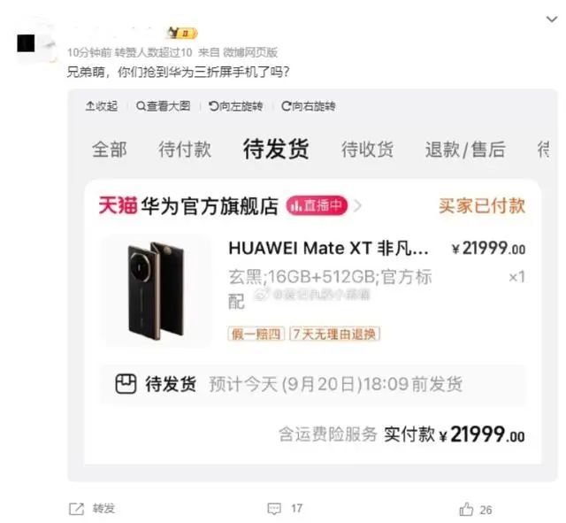 9月19日23时59分,华为商城显示,华为三折叠屏手机——华为Mate XT非凡大师预约结束,超过685万人预约。