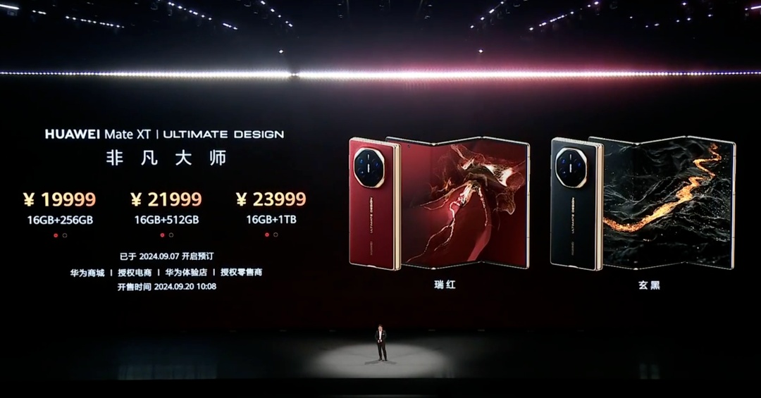 9月10日,华为首款三折叠屏手机——华为 Mate XT非凡大师价格正式公布,其中256GB版本售价19999元、512GB版本售价21999元、1TB版本售价23999元。