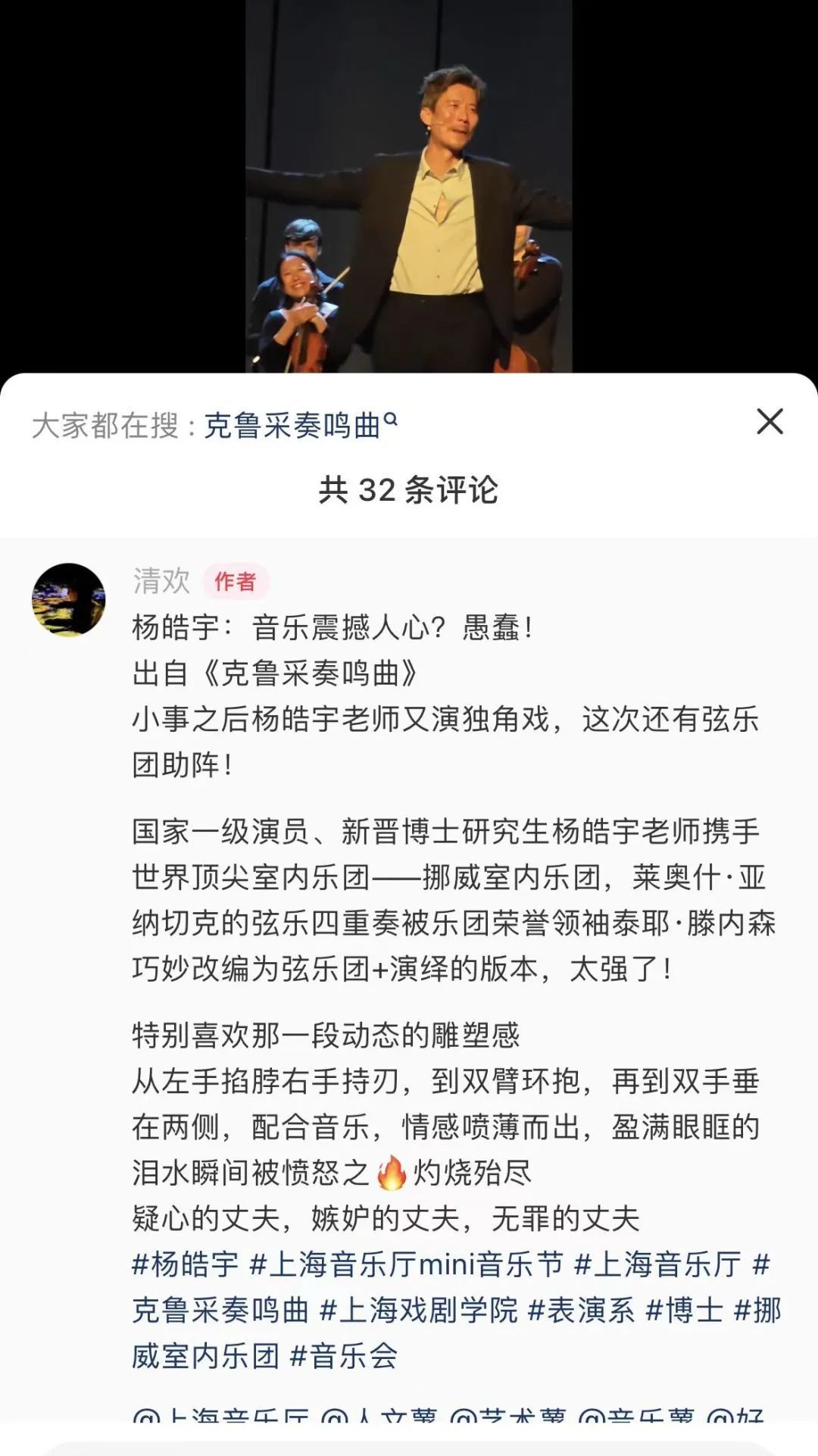 9月21/22日,《克鲁采奏鸣曲》特邀演员杨皓宇独角戏演绎