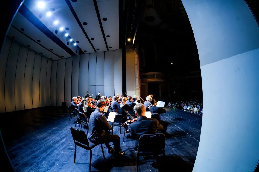 9月22日 19:30,挪威室内乐团携手哈康·克恩斯塔德爵士三重奏带来《爱之歌主题音乐会》,乐手正在场边准备热场,从台下走到台上。