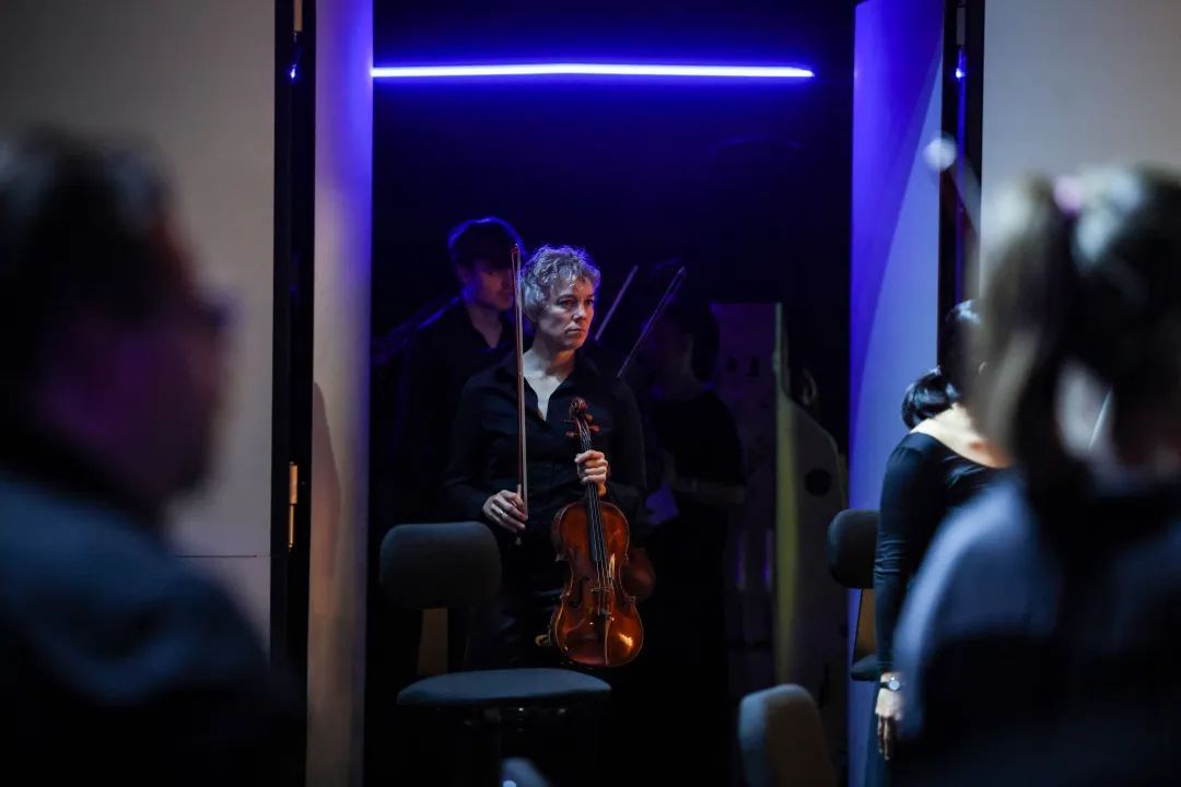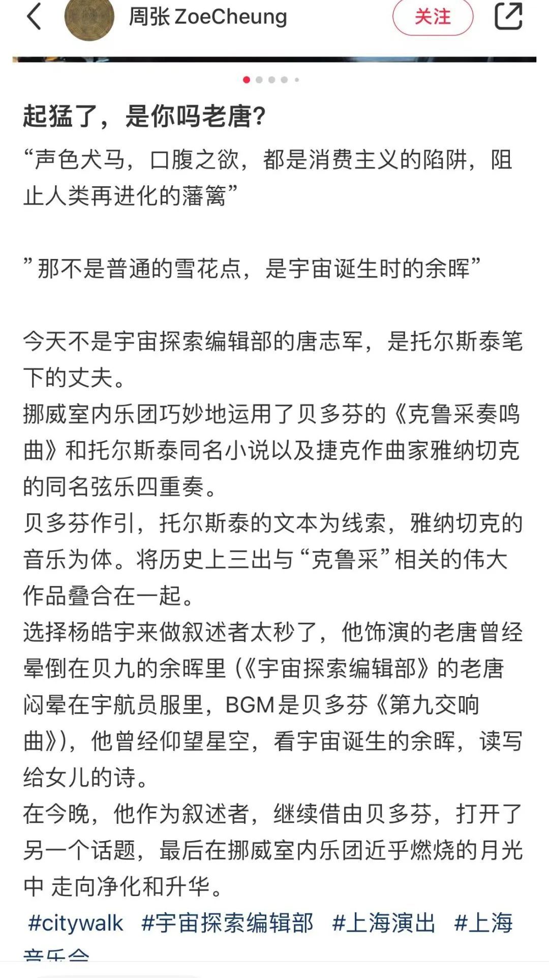 9月21/22日,挪威室内乐团现场演绎的改编版《克鲁采奏鸣曲》亦从小说情节和情感出发,四重奏的四个乐章被完整地演奏出来,配合小说的四个关键节点,使得音乐与文本的结合更加紧密,情感更加深刻。