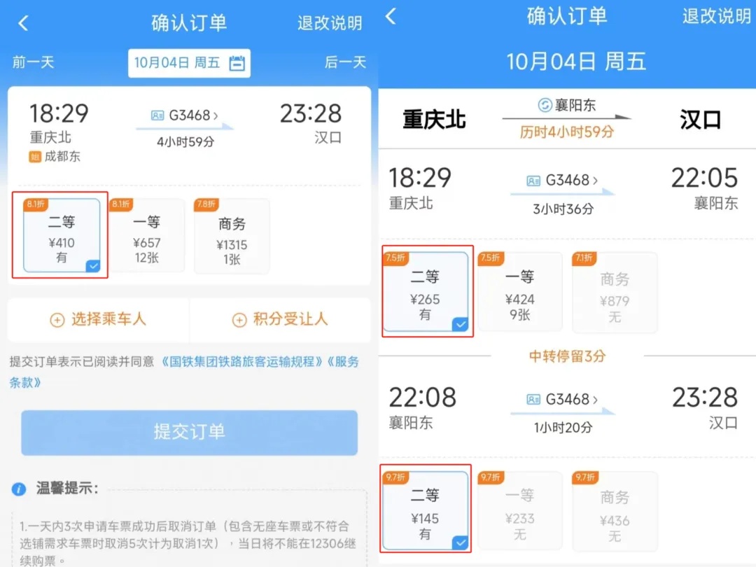 而10月4日从重庆北站出发到汉口站的G3468次列车的折扣则有所不同:直达票二等座为8.1折,410元;车内换座方案分为重庆北站到襄阳东站、襄阳东站到汉口站,前者二等座票价7.5折、265元,后者9.7折,145元,合计410元,与直达票价相同。
