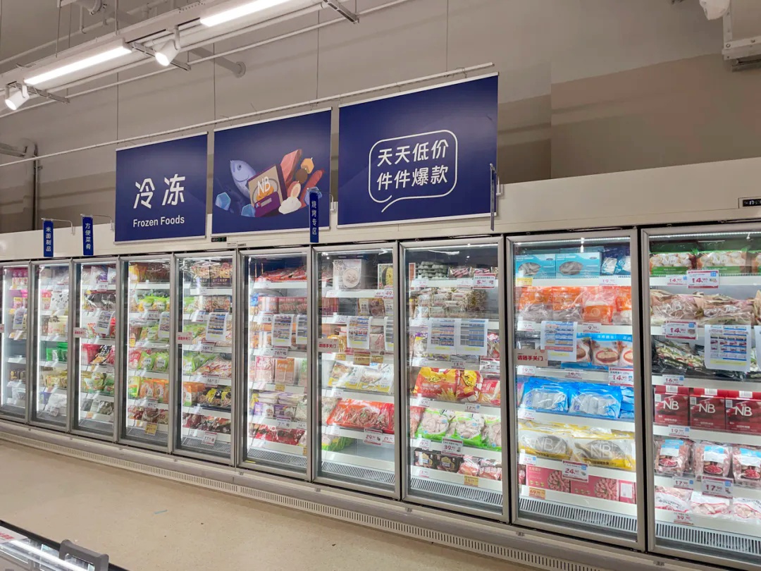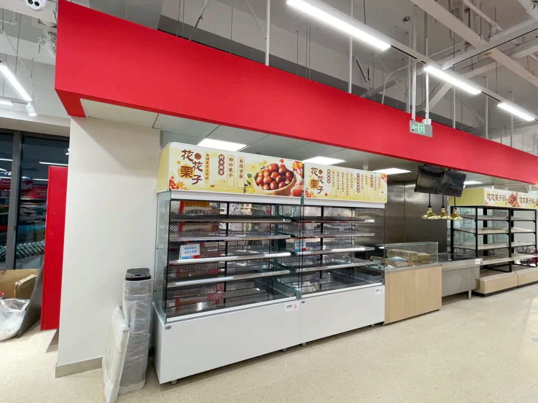 盒马NB崇明新河镇店的面积约950平方米,当前正在火热布置中,为开业做最后的冲刺准备。走进店铺,货架上和冰柜里,冷冻速食、饮料零食、米面粮油、家居日用等商品陈列整齐,果蔬水产、熟食烘焙等将会在开业当天上架。