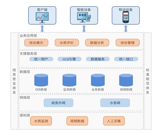 系统实现了各层次间通过接口和服务有机融合,功能模块化构件划分,统一接入数据协议,规范输出共享数据格式和接口。双网融合打破数据边界,破除数据孤岛,建立水质数据库融入数据中心。