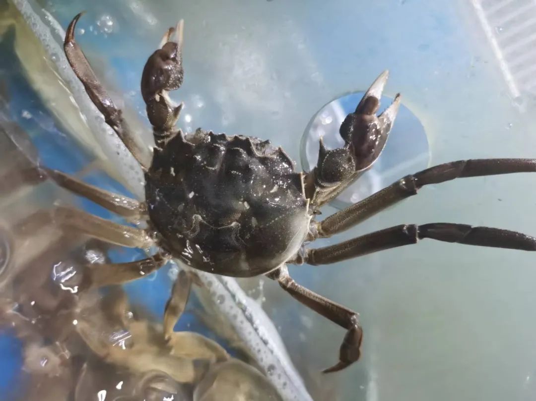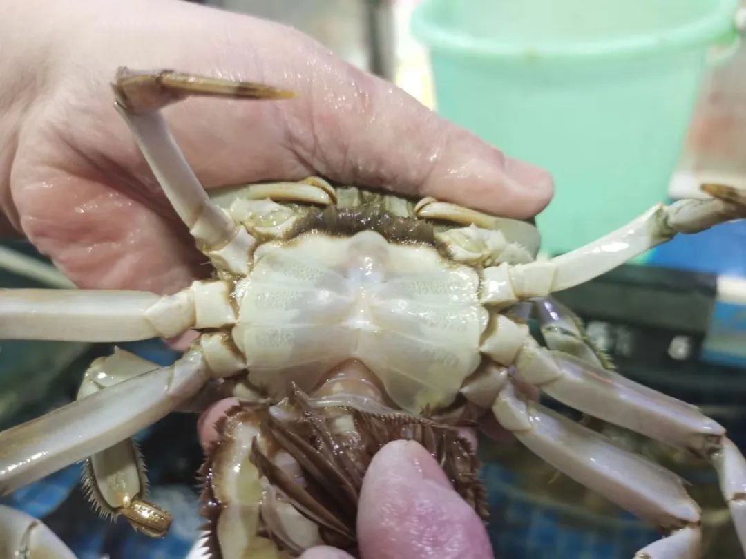 记者在水产摊位上看到,青壳白肚、周身散发着明亮光泽的大闸蟹正欢快地在水中畅游,不时便挥舞着两只毛绒绒的大蟹钳,伸展着四肢极力想要“出逃”。随手拿起一只蟹,便能看到那饱满厚实的背部,扒开圆圆的脐盖,凝聚在腹部的蟹黄若隐若现,令人垂涎。