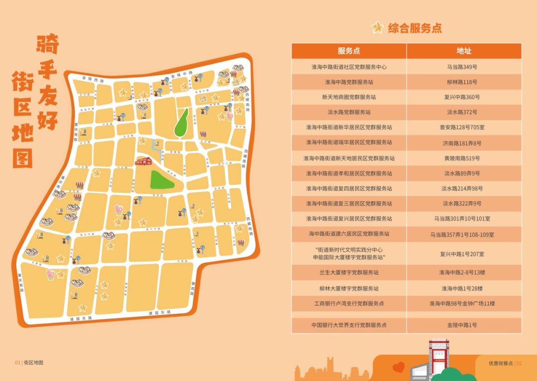 融合街区各级党群服务阵地、零距离家园阵地,提供“一站式”综合服务。围绕新就业群体刚需,将辖区内零散分布的充电、停车、就餐、休憩、学习等个性化服务点位串珠成链,一键集成“骑手友好街区地图”,方便小哥按图索骥快速获取帮助。