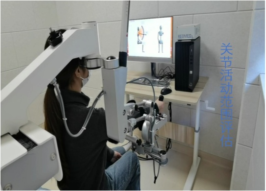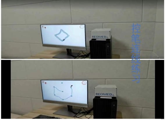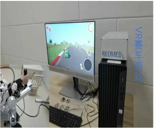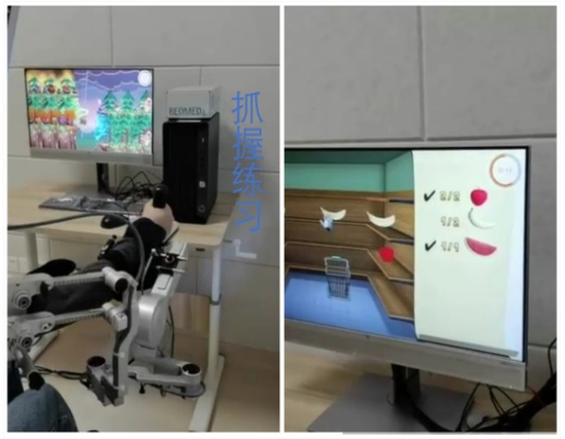 多关节上肢机械臂和压力传感手柄与电脑连接,可以评估上肢各关节主动活动范围与空间运动轨迹,利于制定合适治疗计划,早期可维持关节正常活动范围,后期可进行分离运动练习,防止代偿运动,同时可依据个体情况设定/调整支撑重量,在训练中实时调整游戏难度和握力大小,促进偏瘫侧肢体功能恢复。