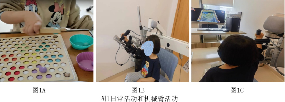 6岁女孩,幼儿园大班,右偏瘫,右上肢各关节活动受限(远端明显),肌张力增高,右手抓握姿势异常,精细活动落后。图1A中,小朋友在使用小镊子夹取物品时右手掌屈、尺偏、拇指内收等异常姿势明显,使用机械臂固定后(肩肘腕),图1B、图1C中可见小朋友右手抓握压力传感手柄时,异常姿势明显改善,并且可使用右上肢独立完成碎碎机游戏训练 。