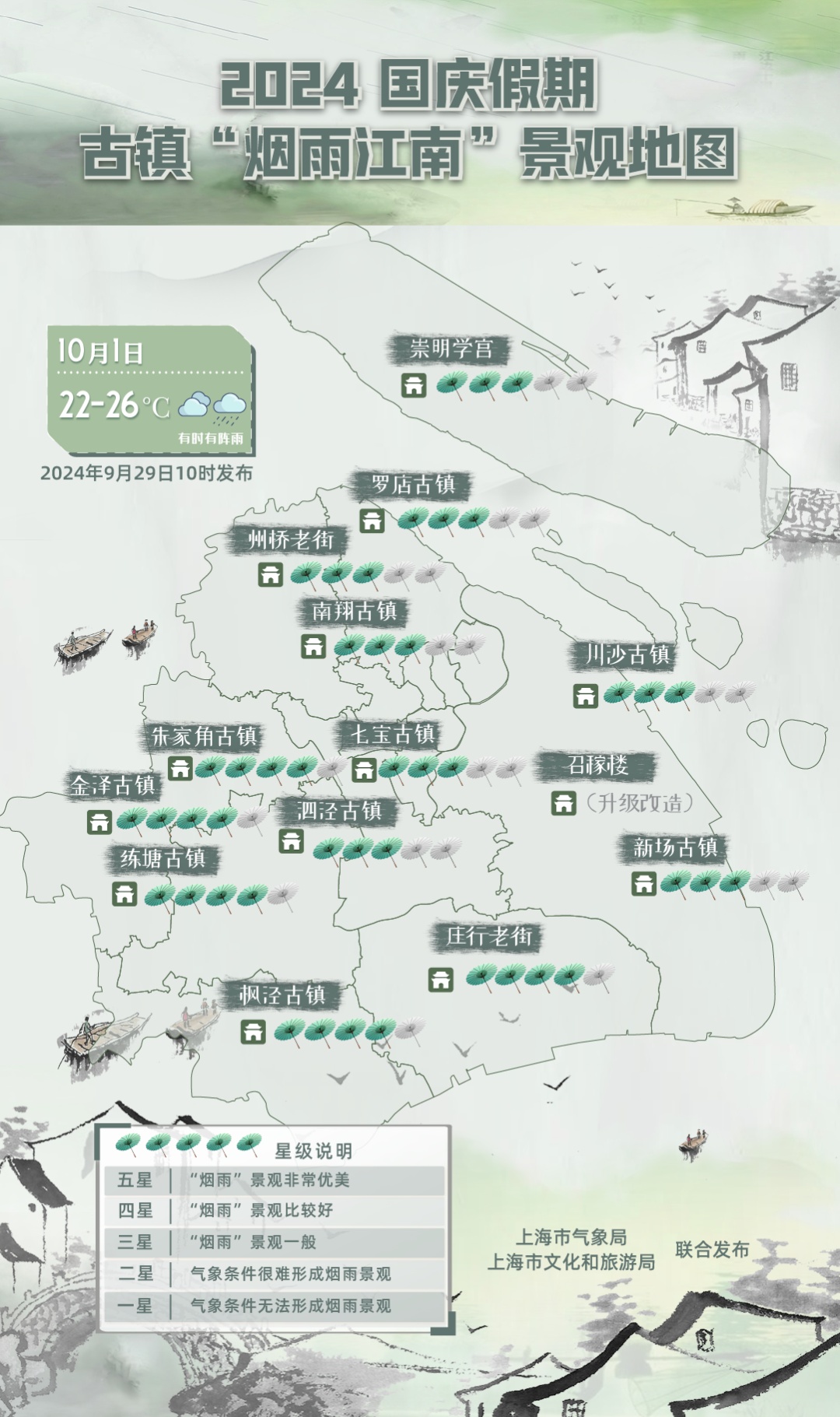 1日可多选择室内游和古镇游观展、购物也都是不错的选择,冷空气造成的降水在1日下午能带来雨雾蒙蒙的景观,选择古镇游感受烟雨江南的韵味秋雨后。