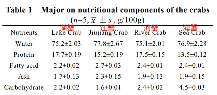 研究发现这四大类螃蟹它们的蛋白质含量普遍较高,范围在13.5%至17.7%之间,而脂肪含量则相对较低,维持在2.2%至2.7%的范围内。