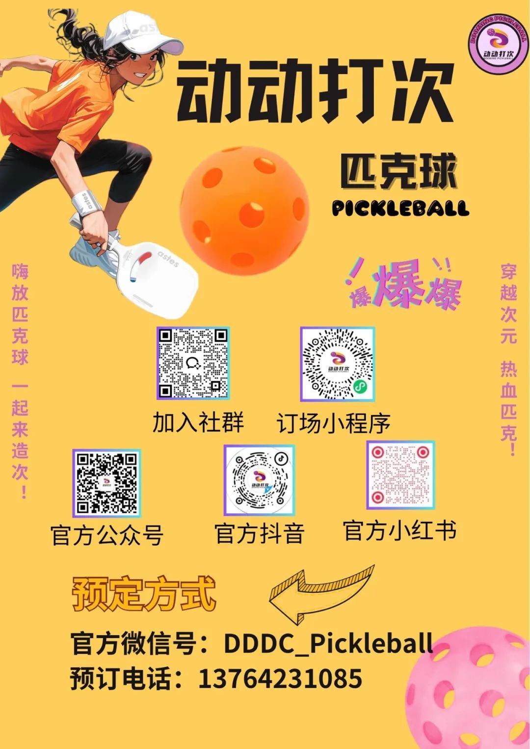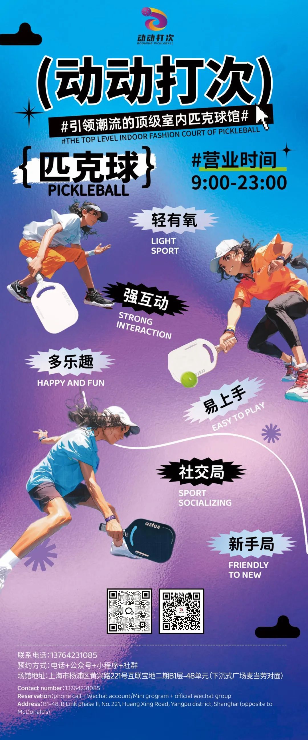 国庆长假 找个地方来打匹克球 吧! 匹克球是近几年新流行起来的 一项体育健身运动 最近 杨浦首家 室内专业匹克球场馆 落户互联宝地二期 动动打次匹克球馆 拥有两块16×9米的标准场地 和一块13×6米的专业培训场地 地面采用8MM弹性丙烯酸场地 全天空调控温 标准场地 有蓝峰场和紫星场两种配色 场馆装修则是巴黎奥运会同款 莫兰迪配色 在简约时尚的环境中 匹克球爱好者能够享受 舒畅丝滑的打球体验 匹克球运动 除了具有强互动的特性外 它还有轻有氧、多乐趣、 易上手等特点 很适合“社交局”和“新手局” 场馆内还设置了拍照打卡区、 多功能舞台区和高颜值水吧区 满足顾客的多元需求 会员还可免费畅饮咖啡饮品 会员储物柜和专用更衣间 方便顾客享受运动乐趣 动动打次匹克球馆 地址: 杨浦区黄兴路221号互联宝地二期B1层48单元 交通: 驾车:导航至互联宝地即可 地铁:地铁12号线宁国路站 预约: 官方微信号:DDDC_Pickleball 预定电话:13764231085