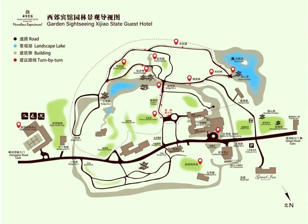 西郊宾馆具有丰富的园林资源与优美的自然景观。今年,配合时令景观,西郊宾馆以八大主题景观园区为核心,推出“探索城市秘境”的“西郊游园荟”,并发布线路导览图,丰富游客的体验感和互动性。