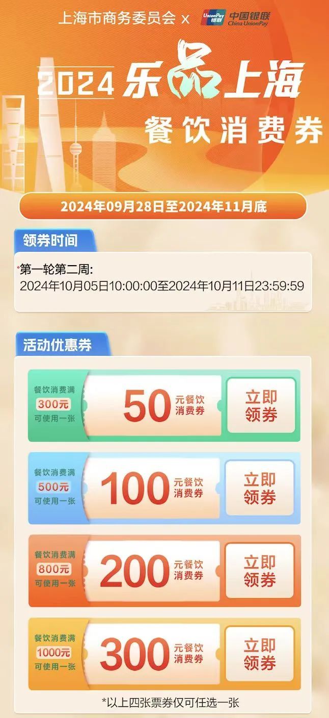 注意事项:云闪付、支付宝平台领券时无地域限制,微信平台消费券需到上海后领取。