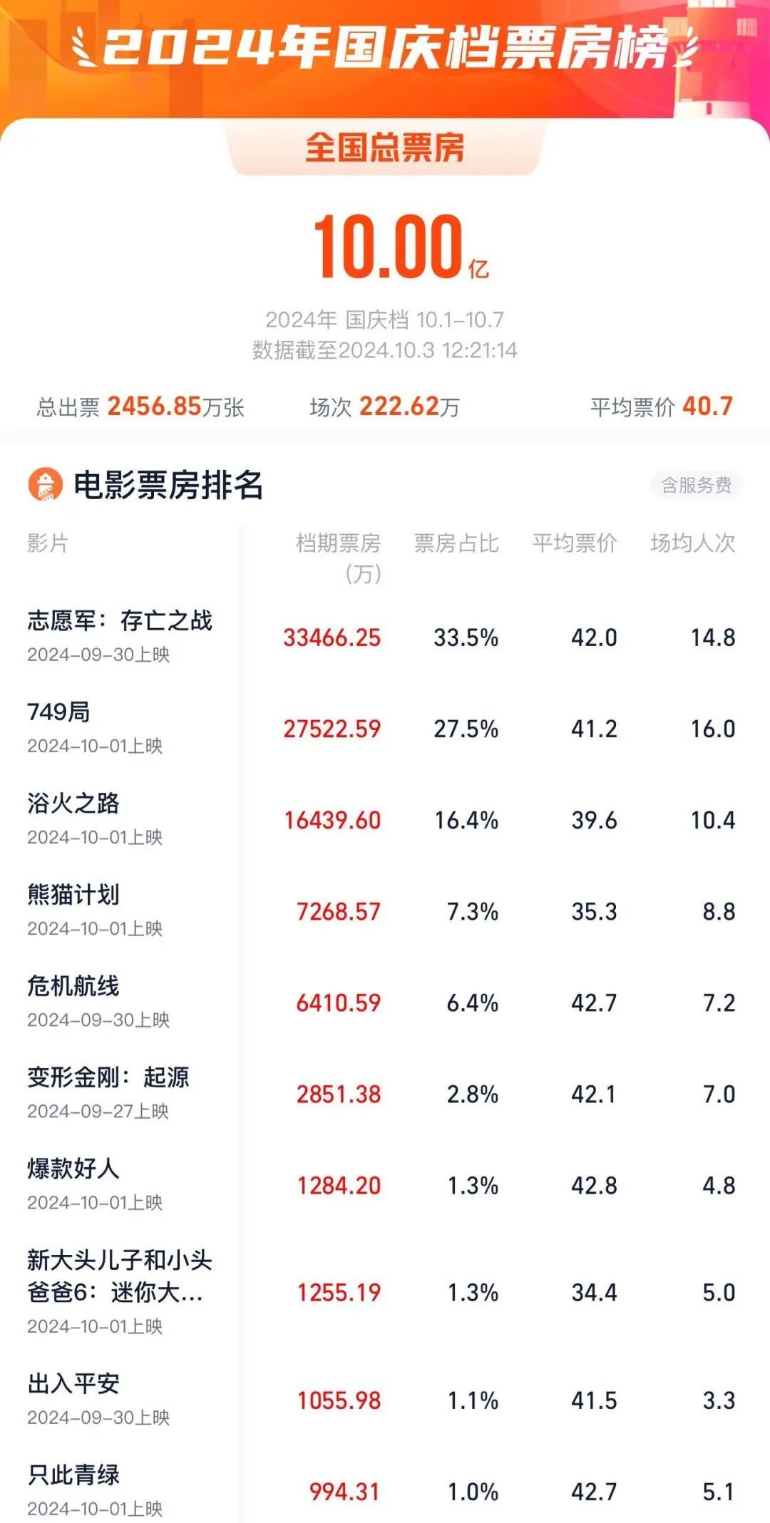 而在3日中午12时20分,国庆档总票房(含预售)突破10亿,破10亿速度快于去年国庆档。