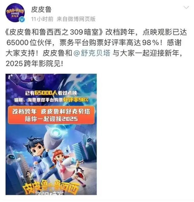 同日宣布退出国庆档的,还有另一部动画电影《皮皮鲁和鲁西西之309暗室》。该片于10月1日上映,目前累计票房308万元,宣布改档跨年。