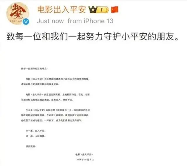 10月3日晚,国庆档影片《出入平安》官方微博宣布影片撤档:“电影在上映期间遭遇到了前所未有的困难和挑战,遗憾未能与更多满怀期待的观众见面。《出入平安》决定退出国庆档,上映档期待定。”